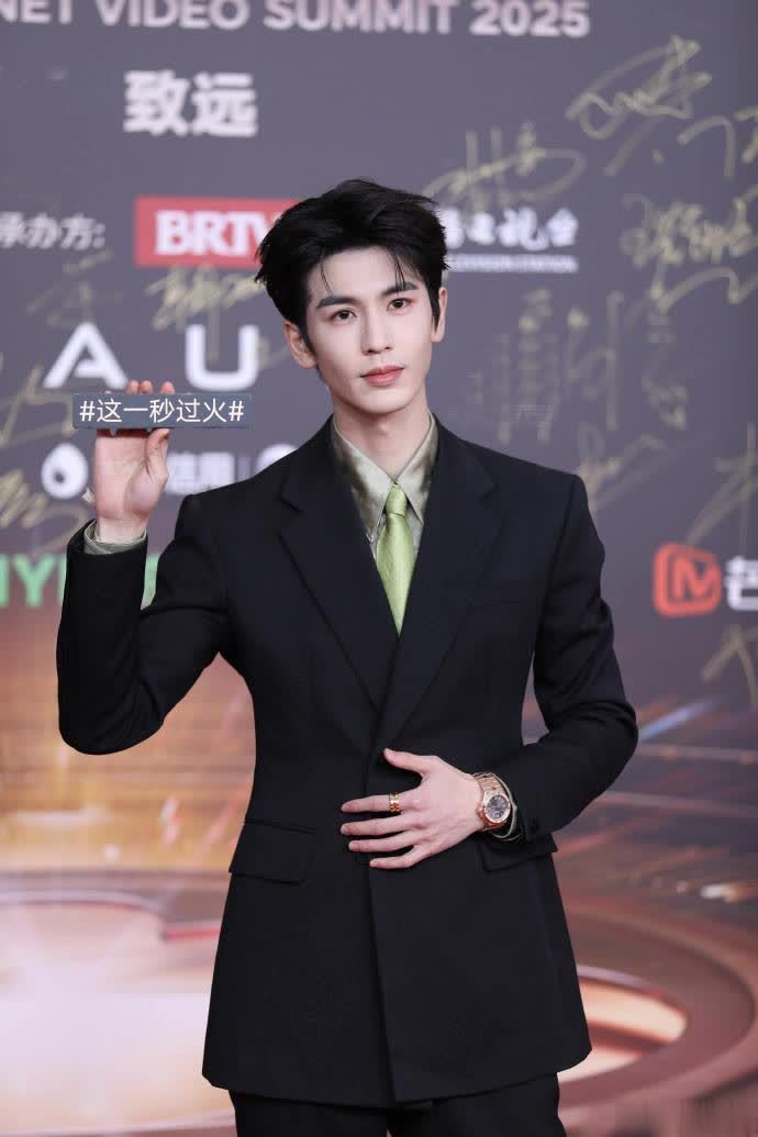 张凌赫以电视剧《爱你》中何苏叶医生的形象亮相红毯,黑色西装搭配墨绿色衬衫,看起来贵气十足,典型的360度无死角的帅气。